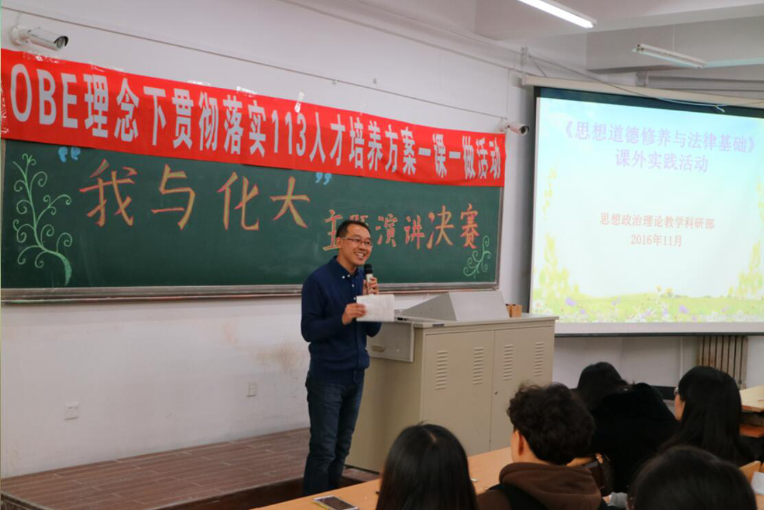 2016年11月9日下午1:30在应星楼104教室,由思政部品德与法律教研室策划举办了OBE理念下贯彻落实113人才培养方案“一课一做”活动,主题是“我与化大”演讲比赛,本次比赛于2016年9月19日开始启动,2016级本科生制药、环境、应化、金融、社工、材化和能源等七个特色专业15个班的同学参加了本次活动。
