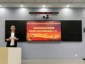 孔凡飞老师领读领学了《习近平对研究生教育工作作出重要指示强调:适应党和国家事业发展需要 培养造就大批德才兼备的高层次人才》。他从世界“百年之未有大变局”的复杂背景出发,深刻理解国际竞争在本质上是人才的竞争。指出党执政兴国的历史经验告诉我们,越是复杂矛盾、任务艰巨的目标,越是需要“关键少数”来发挥决定作用。人才尤其是高层次人才是党执政兴国的第一资源、高层次人才培养要造就“德才兼备”的人。