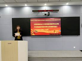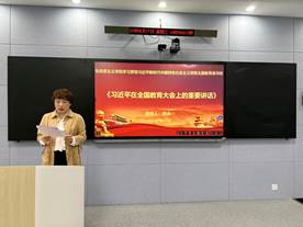 佟守琴老师领读领学了《习近平:把思想政治工作贯穿教育教学全过程 开创我国高等教育事业发展新局面》。佟老师从立德树人是高校思想政治工作的中心环节、“三全育人”教育战略和做好高校思想政治工作,要懂得变通和创新、要用好课堂教学这个主渠道、要加快构建中国特色哲学社会科学体系和教材体系以及高校教师要明道、信道,努力成为先进思想文化的传播者、党执政的坚定支持者等角度谈谈认识,并结合自身教育教学工作谈不足,从加强新媒体技术的学习,加强信息技术的利用等方面更好地提高教育实效,促进教学目标的达成。