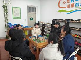 活动中,刘老师带领同学们走进沙盘。在导入环节,通过认识、触摸、感受,了解团体沙盘的规则和操作方法。在摆放环节,同学们不能有言语交流,自行挑选喜欢的沙具进行创作:有的成员挑选沙具时犹豫不定,有的同学喜欢调整其他同学的沙具,有的同学会配合其他同学的摆放。大家在差异中感知人与人的不同,在情感上实现了无声的交流与碰撞。在讨论环节,同学们在老师的陪伴引导下进行言语交流:充分借由沙盘投射自我的想法、感受、观点,比如回忆哪些沙具是自己摆放的,摆放沙盘过程中的各种想法,沙具被人挪走时的感受,对哪个沙具还有纠结,自己最喜欢哪一部分,给共同的作品命名。最后老师和同学们进行总结,让同学们更深刻地借由沙盘更加深入的了解自我,体会界限和规则的必要性,体验言语沟通表达的重要性,学习人际交往的原则和技巧,感受复盘总结的有效性。